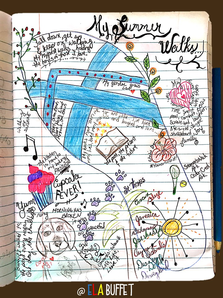 Pinterest is full of awesome sketchnote ideas, and I thought my friends would like trying out an idea page that was a combination of doodles, sketches, words, phrases, and anecdotes. The only sketch that was necessary was the foot outline, so the non-artist types (like me) didn’t feel pressure to include drawings. They just had to have some fun sharing the summer travels they went on. With their feet!