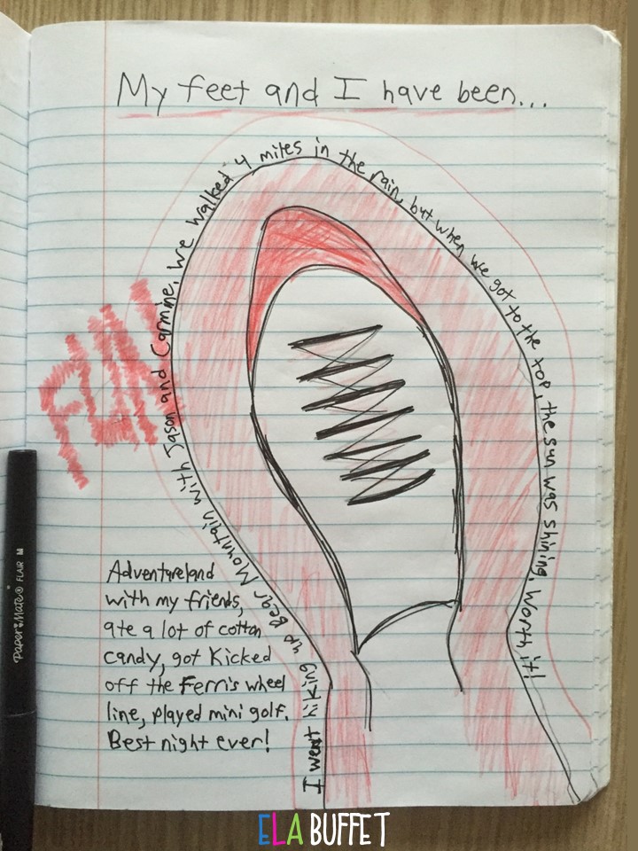 The foot below is one that another non-artist did. Although it seems like he didn’t write much, he actually planted some seed ideas for what could be some pretty cool writing pieces. He included anecdotes about a personally satisfying hike up a mountain with some friends that can translate into a memoir. And he wrote a little bit about a fun night in an amusement park that resulted in getting kicked off the Ferris wheel line, which would make an interesting narrative.